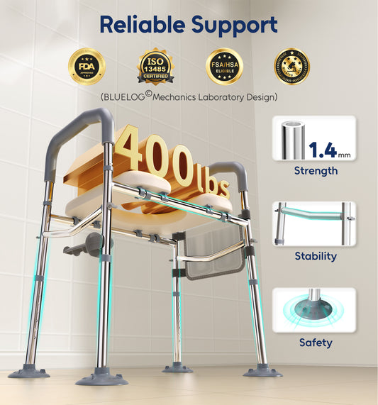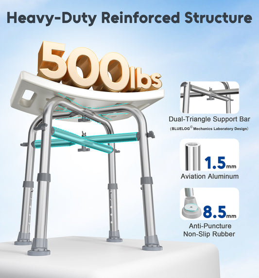 Bluelog Shower Chair for Inside Shower, 500lbs Heavy-Duty Bath Stool with Reinforced Crossbar, Padded Tub Seat, Adjustable Height for Adults, Elderly, Disabled, Tool-Free Assembly