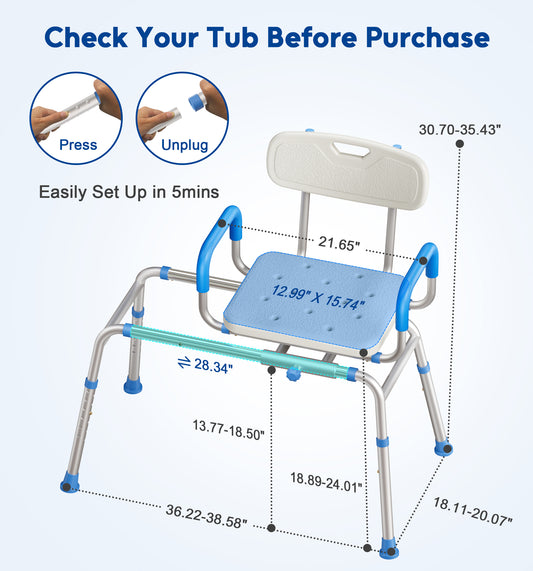 Bluelog FSA/HSA Eligible Sliding Shower Chair with Extra-Wide 360° Swivel Seat, 330lbs Tub Transfer Bench, Non-Slip & Padded Arms, Adjustable Height for Elderly & Disabled Inside Shower, Rectangular