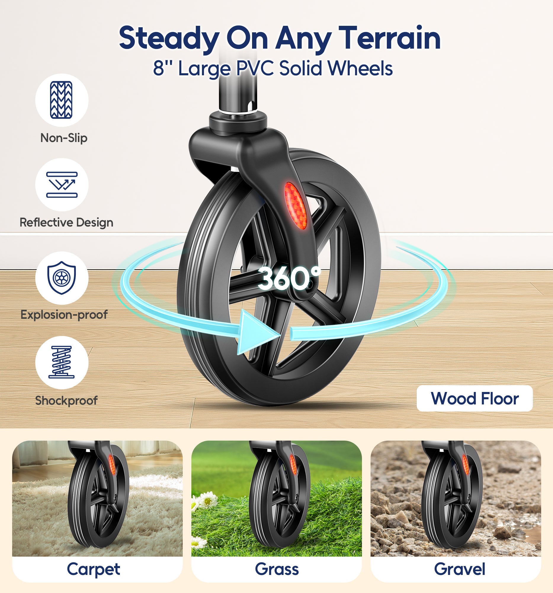 Triple Safety Brake and Nighttime Visibility: The Rollator with Seat features a three-mode braking system (free rolling, deceleration, full stop) and anti-pinch folding joints for safety. Multiple reflective strips and 360° swivel front wheels improve nighttime visibility and maneuverability, which is critical for early morning walks or evenings out, ensuring safe travel in dimly lit areas