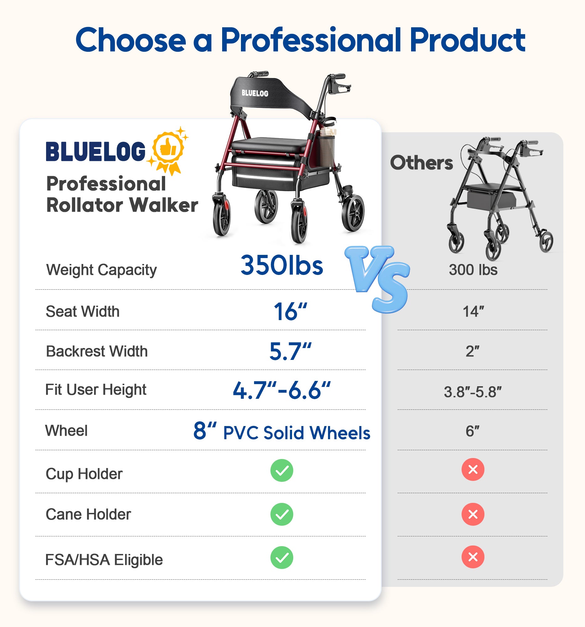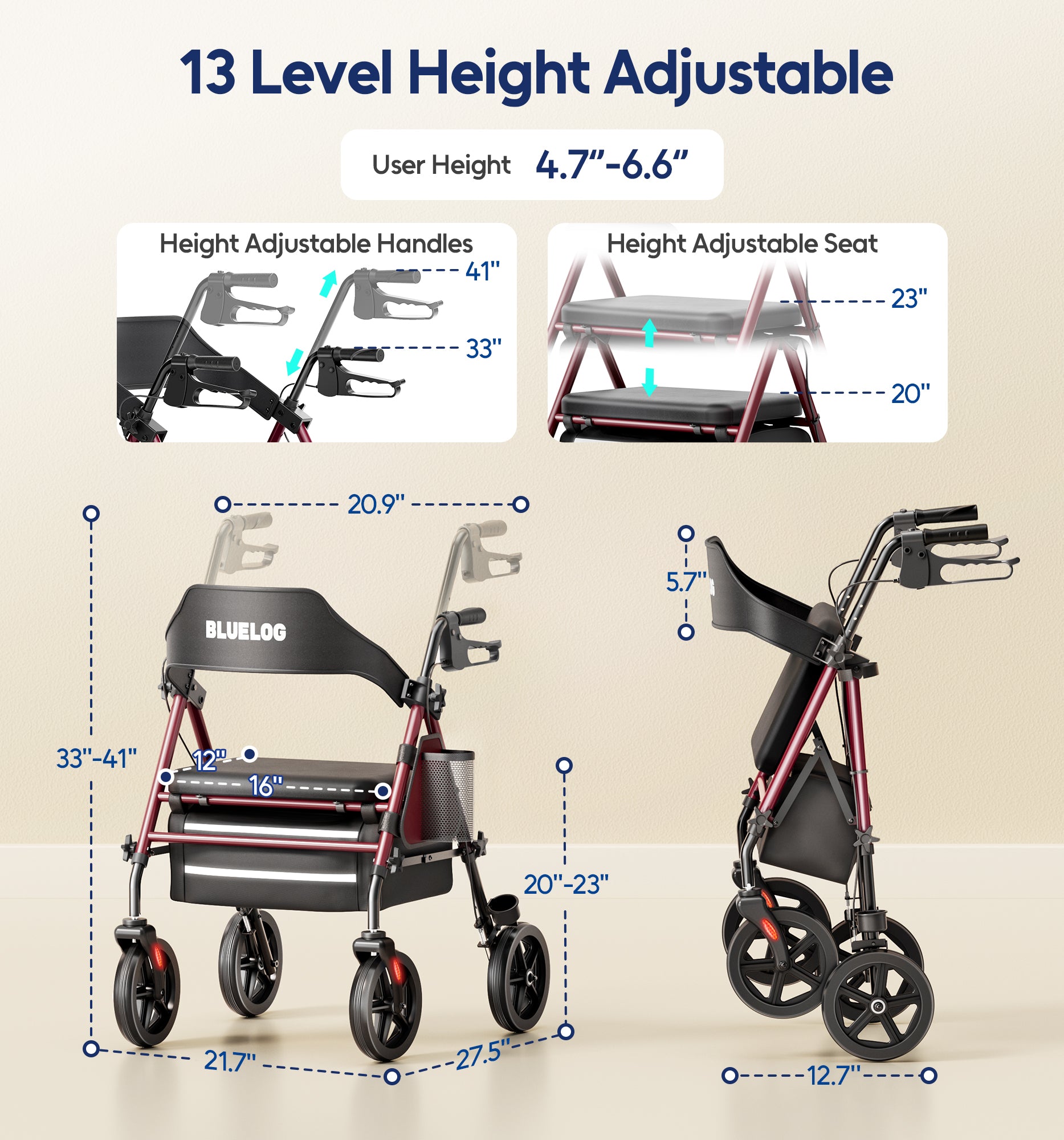 Adjustable Comfort for All-day Use: This Senior Rollator with Seat offers 6 levels of handle height adjustment (for heights from 4'7“ to 6'6”) and a 3-position seat with a breathable backrest. The wider memory foam seat and breathable backrest reduce pressure on the hips and spine, making this Rollator with Seat ideal for extended periods of time away from home